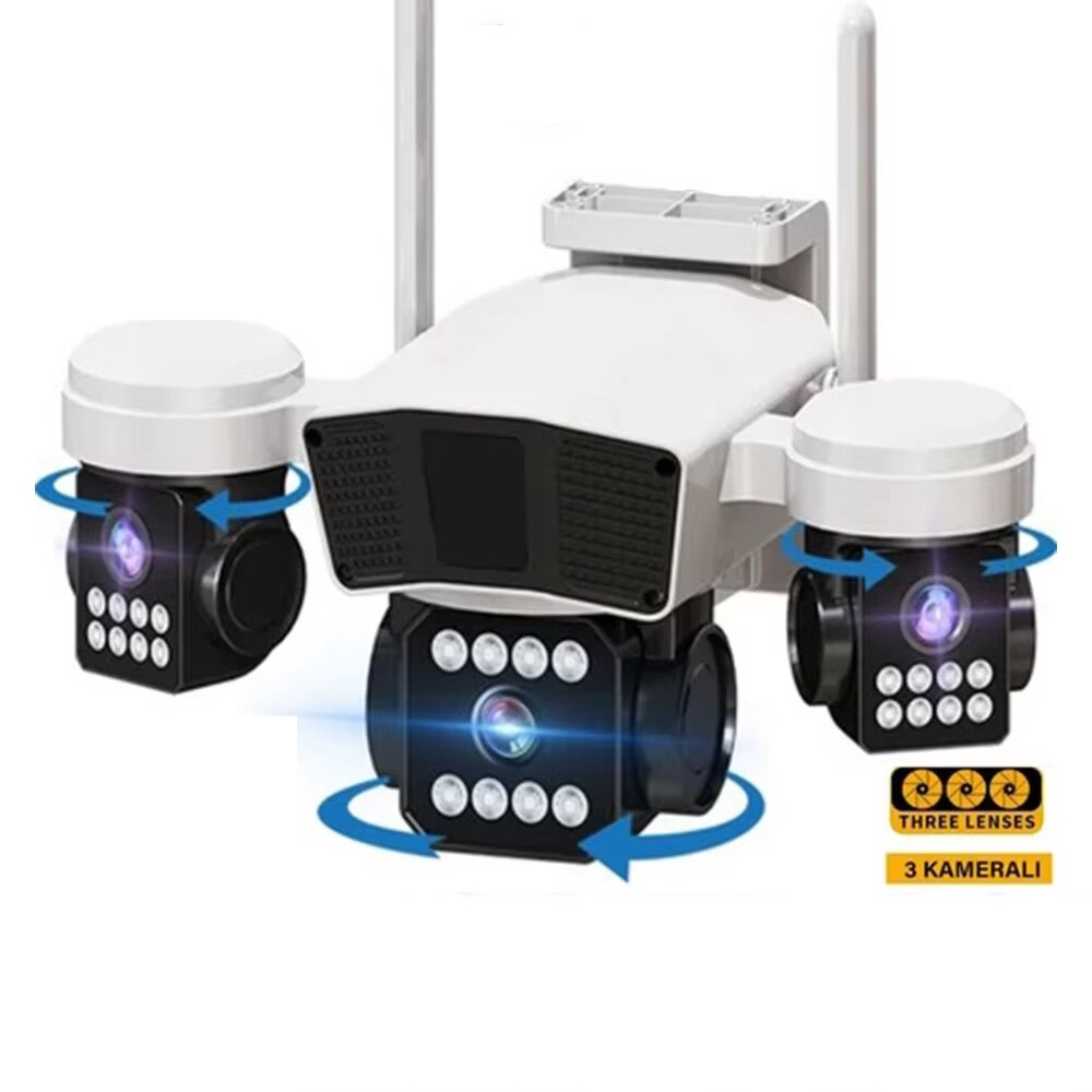 دوربین سیم کارتی سه لنز با طراحی خاص خود، گزینهای کاربردی برای نظارت در محیطهای بیرونی و داخلی محسوب میشود. این دوربین بی سیم دارای سه لنز مجزا است که ظاهر آن را از سایر دوربینهای نظارتی متمایز میکند. لنزهای کناری به شکل مکعبی طراحی شدهاند و هرکدام از طریق دست قابل تنظیم هستند. لنز وسطی به صورت کروی بوده و دارای موتور داخلی است که امکان چرخش از طریق تلفن همراه را فراهم میکند. هر سه لنز با LEDهای دید در شب احاطه شدهاند تا در محیطهای تاریک نیز تصویری واضح ارائه دهند. جنس بدنه دوربین از پلاستیک مقاوم و ضد آب ساخته شده است و دارای استاندارد IP65 میباشد که از نفوذ آب و گرد و غبار جلوگیری میکند.