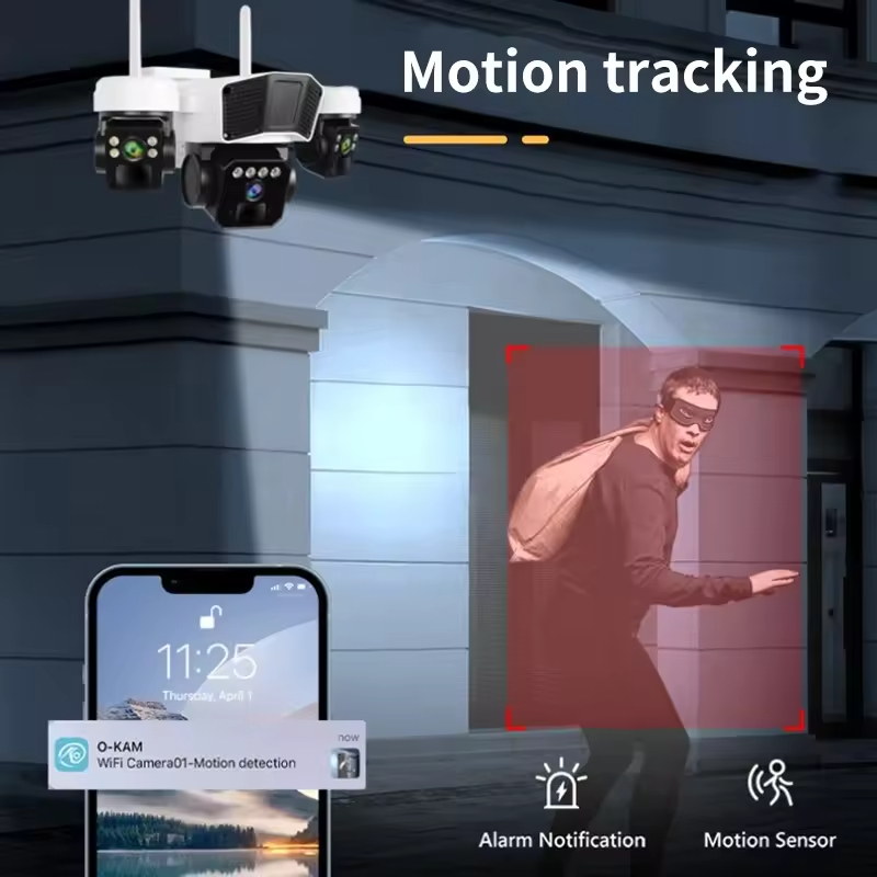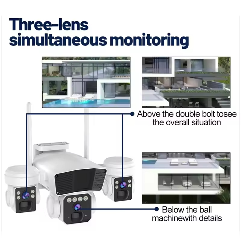 این دوربین نظارتی با 3 لنز واقعی با بهرهگیری از پنل خورشیدی و اتصال 4G از طریق سیمکارت ، امکان نظارت مداوم در مناطق فاقد دسترسی به برق و اینترنت را فراهم میسازد نرم افزار آن نیز OKAM pro بوده. این کالا برای استفاده در محیطهای باز مانند باغها، ویلاها، مزارع و پروژههای دورافتاده مناسب بوده و با قابلیتهای دید در شب رنگی، تشخیص حرکت، مقاومت در برابر شرایط جوی و نصب آسان، یک راهکار مستقل و هوشمند برای تأمین امنیت در فضاهای خارج شهری محسوب میشود.لنز های کناری این دوربین با دست میچرخن و قابل تنظیم هستند و لنز اصلی و میانی دوربین با موبایل از راه دور کنترل میشود و به همه جهات میچرخد.